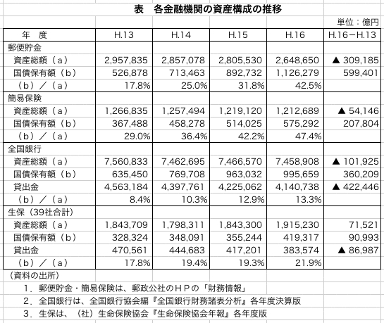 いやはや、郵政民営化するとこんな良いことがあるってなことを言うのもいいけど、過去4年間の民間を含めた金融機関の国債保有額の推移を見といた方がいいんでないか。あんまりバカらしいから。